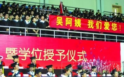 吳阿姨的演講剛結束,更意想不到的事情發生了。29棟宿舍數理學院的學生齊刷刷地全體起立,高呼“吳阿姨,我們愛你!我們永遠記得你!”并拉出了一條“蓄謀已久”的橫幅,橫幅上的“吳阿姨,我們愛您”幾個字驟然使全場的溫情指數升到最高值。就連身著學位服,坐在主席臺上的李廉水校長都開始偷偷擦眼淚。這一幕被攝像機投影到了全場的大屏幕上,不少女生開始小聲抽泣。