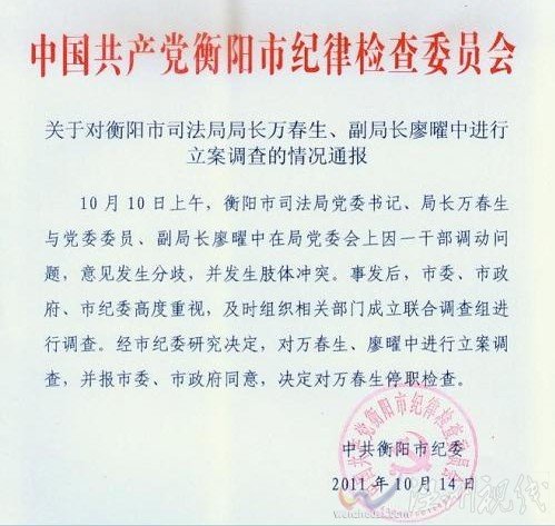 中新網(wǎng)10月14日電 據(jù)湖南衡陽黨政門戶網(wǎng)站消息,因10月10日衡陽市司法局局長(zhǎng)萬春生與副局長(zhǎng)廖曜中因一干部調(diào)動(dòng)問題發(fā)生肢體沖突,湖南衡陽市紀(jì)委決定對(duì)兩人進(jìn)行立案調(diào)查,并對(duì)局長(zhǎng)萬春生停職檢查。