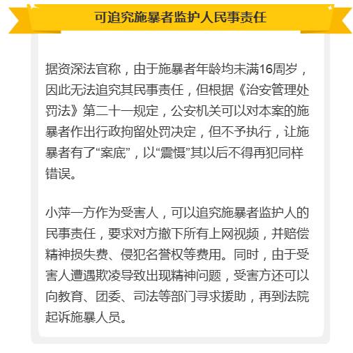其實,究竟是不是校園欺凌,并非一個多么難判斷的問題。在兩段3分多鐘視頻中,一男孩對身穿紫色短袖的小女孩連扇耳光后,另外一男孩從遠處跑來一腳踹向女孩腰部將其踢倒,緊接著幾名男子輪番掌摑該女孩,并用衣服蓋住女孩頭部進行圍毆,隨后幾名女孩對其連續扇耳光,并強行撩起其上衣進行羞辱。如果這都不算校園欺凌,如果這都不違法,的確有違公眾的認知。