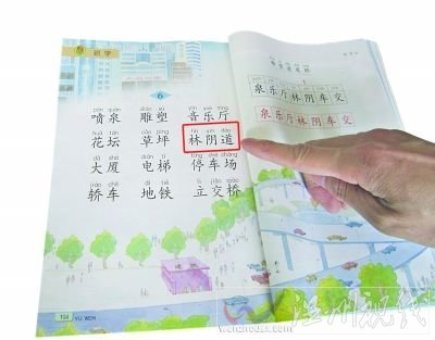 帶著網友的質疑,記者來到蘇州新區獅山實驗小學。在校方提供的江蘇教育出版社出版的小學一年級上學期教科書第104頁上,記者果然看到了“林陰道”一詞。該小學一年級語文教師陸菊敏告訴記者,他從事小學語文教育已經有17年了,自從語文書從人教版換成蘇教版后,這15年里一直都是“林陰道”,他們也是一直這樣教的。